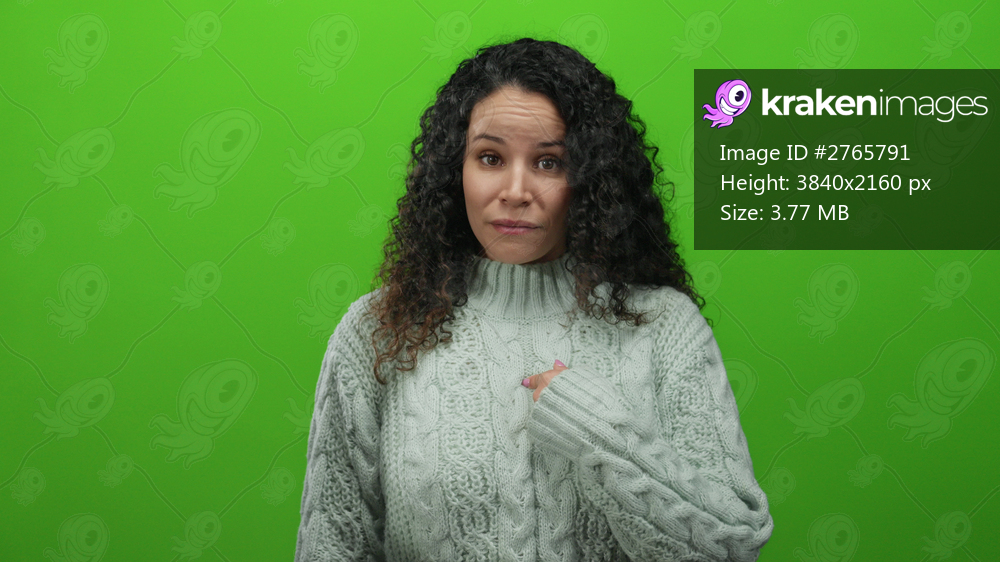 Hispanic woman wearing cable-knit sweater smiles and gives thumbs up against vibrant green background, conveying positive emotions and approval.