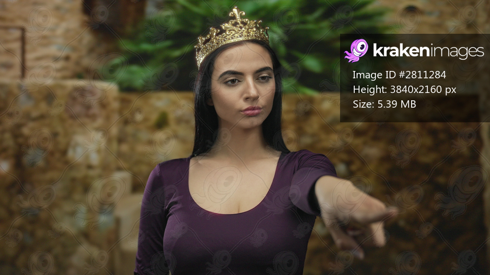 Hispanic woman wearing crown gestures confidently outdoors against rustic street backdrop highlighting cultural royalty.