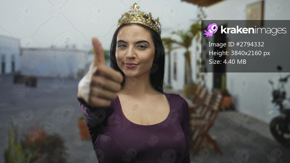 Hispanic woman wearing crown gives thumbs up on street with blurred outdoor background, expressing positivity and confidence in urban setting.