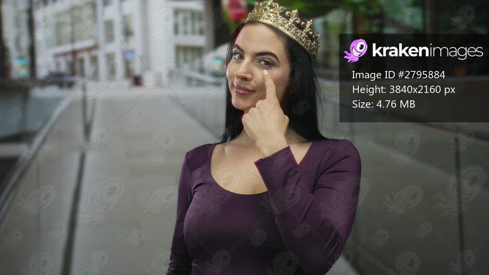 Hispanic woman wearing crown points to her eye with confidence on an outdoor urban street, embodying empowerment and elegance in the city setting.