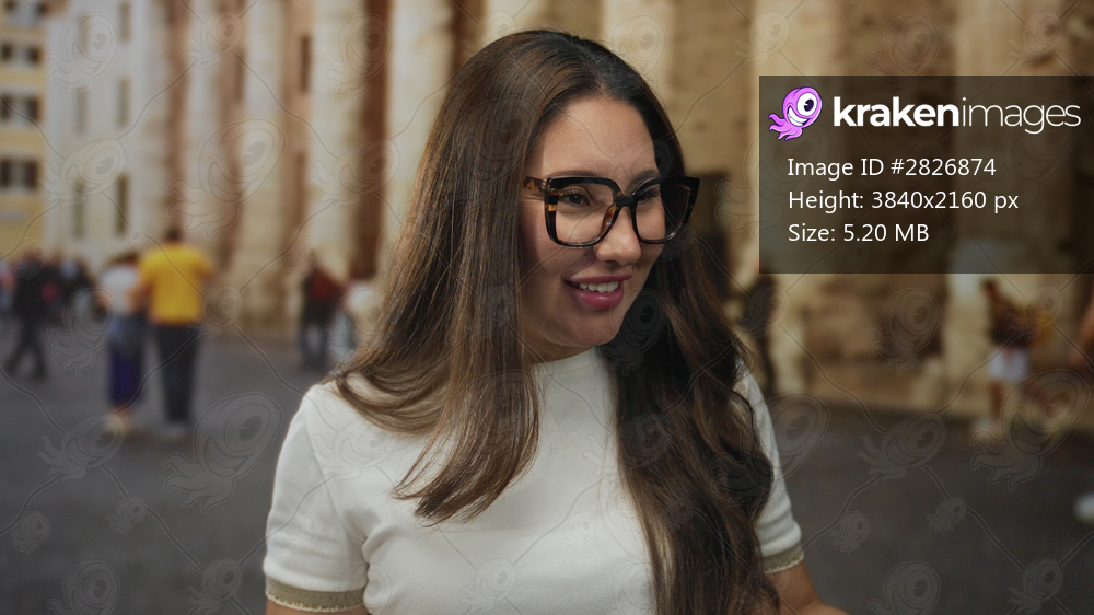 Hispanic woman wearing glasses and a white shirt smiles in front of a historic stone building; carefree joy.