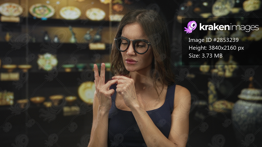 Hispanic woman wearing glasses examines fingertip while standing in building surrounded by artifacts; curiosity.