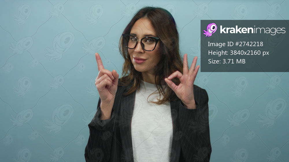 Hispanic woman wearing glasses gesturing okay sign isolated over blue background showcasing professional confidence in simple attire with expressive facial gesture. - Kraken Images