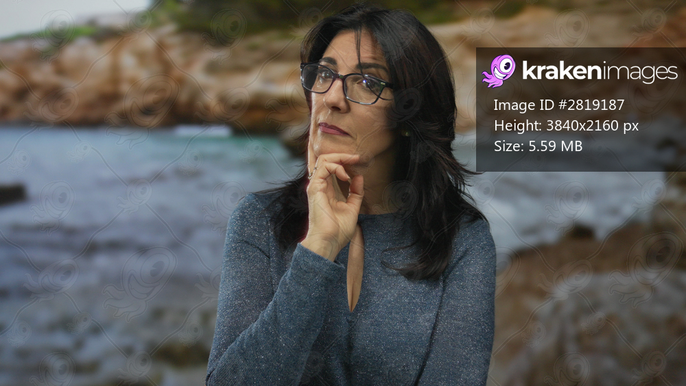 Hispanic woman wearing glasses hand on chin at beach rocks and ocean horizon visible in daylight; reflection.