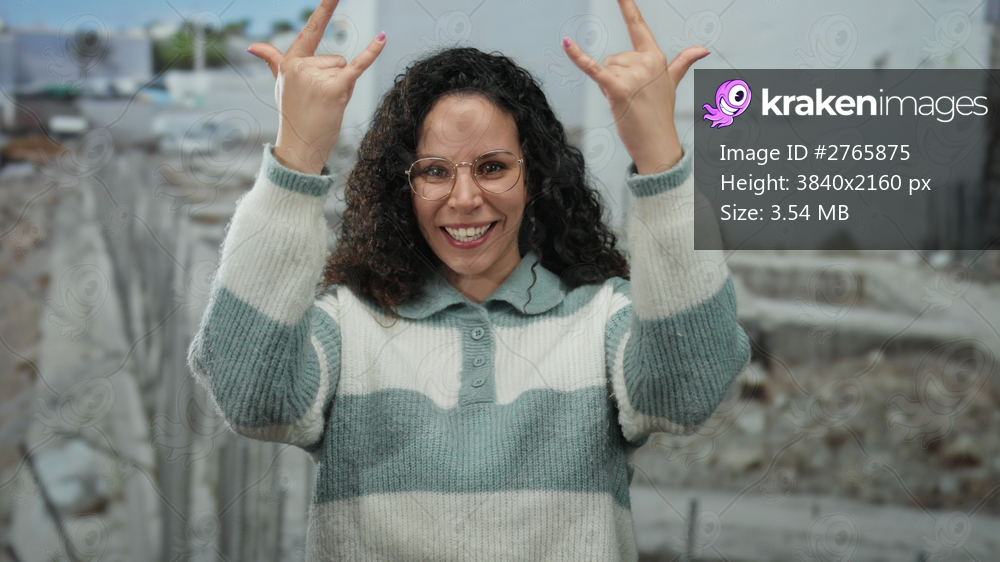 Hispanic woman wearing glasses makes a rock gesture at a construction site with a casual sweater outdoors, showcasing confidence and style in an urban environment. - Kraken Images