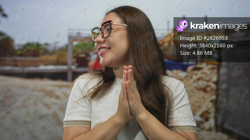 Hispanic woman wearing glasses smiling and clasping hands inside a partially constructed building at a construction site; gratitude.