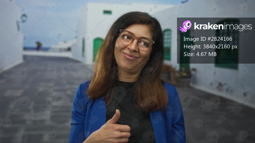 Hispanic woman wearing glasses smiling with hand in thumbs up gesture on sunlit street; confidence optimism empowerment encouragement.