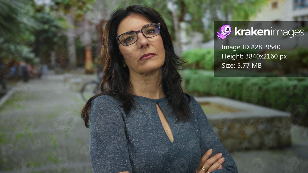 Hispanic woman wearing glasses stands with crossed arms on a green park pathway near a bench and bicycle rack; rejection.