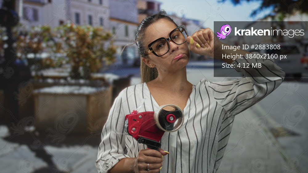 Hispanic woman wearing glasses and striped blouse holding red tape dispenser and rubbing her eye on street; packing frustration.