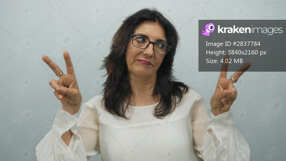 Hispanic woman wearing glasses and white blouse displays peace sign with both hands in light blue studio; peace.