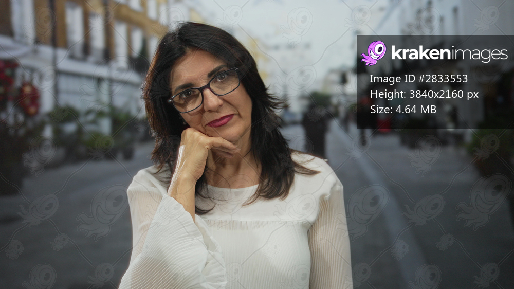 Hispanic woman wearing glasses and white blouse with hand on chin standing outdoors on city street; quiet reflection.