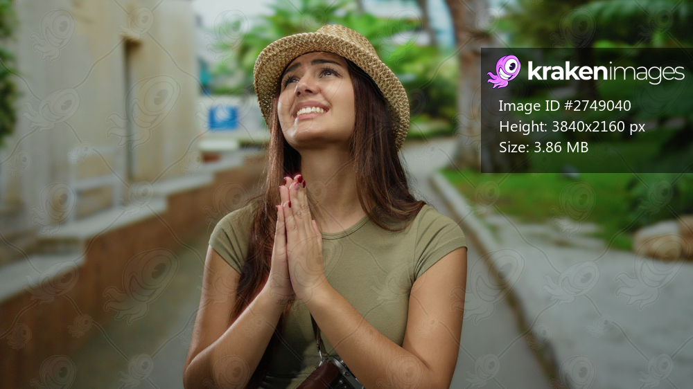 Hispanic woman wearing hat smiling with camera in green outdoor setting praying with hope and joyfully enjoying her travel experience in a peaceful serene environment - Kraken Images