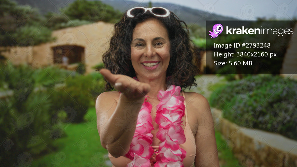 Hispanic woman wearing hawaiian lei in bikini extends hand to camera in park; invitation connection welcome warmth.