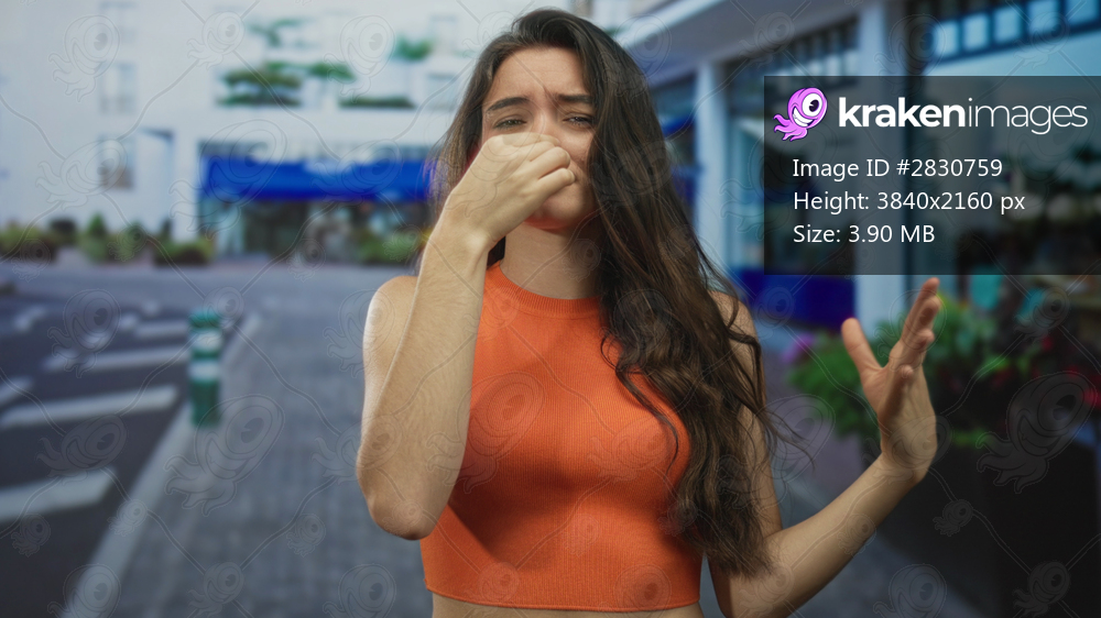 Hispanic woman wearing orange crop top pinching nose and waving hand on a crowded urban street; disgust.
