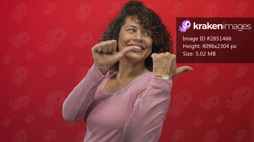 Hispanic woman wearing pink shirt pointing thumb to chest in studio; confidence empowerment positivity.