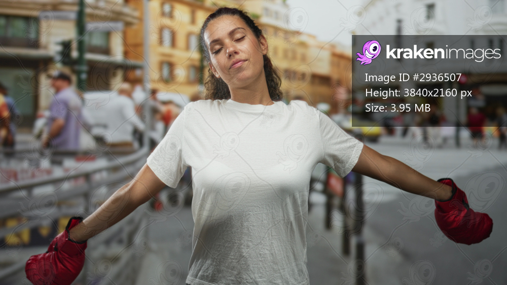 Hispanic woman wearing red boxing gloves, arms outstretched and eyes closed on a busy street, white t shirt and relaxed posture; serenity.