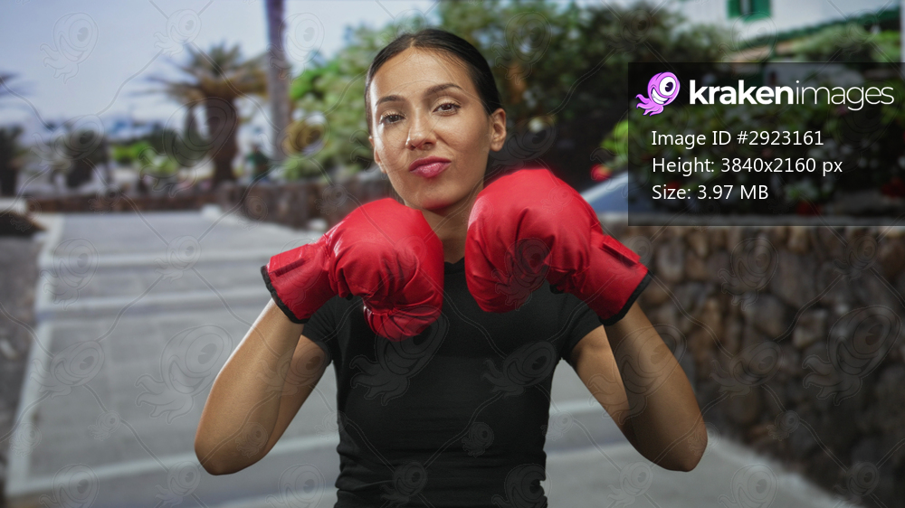 Hispanic woman wearing red boxing gloves holds fists up in guard on a sunlit stone street walkway lined with palms and shrubs; confidence empowerment.