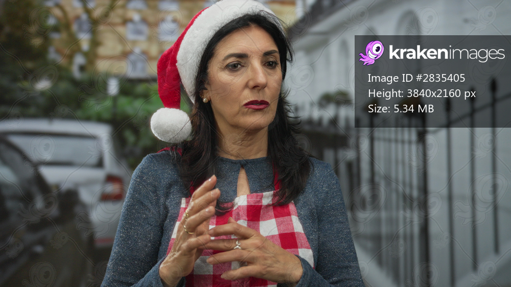 Hispanic woman wearing santa hat and red checkered apron touches fingertips in city street beside parked cars and iron fence; concern.