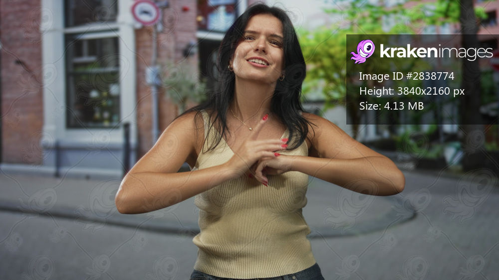 Hispanic woman wearing sleeveless top hits her palm in a fighting gesture on a sunlit urban street; defiance.