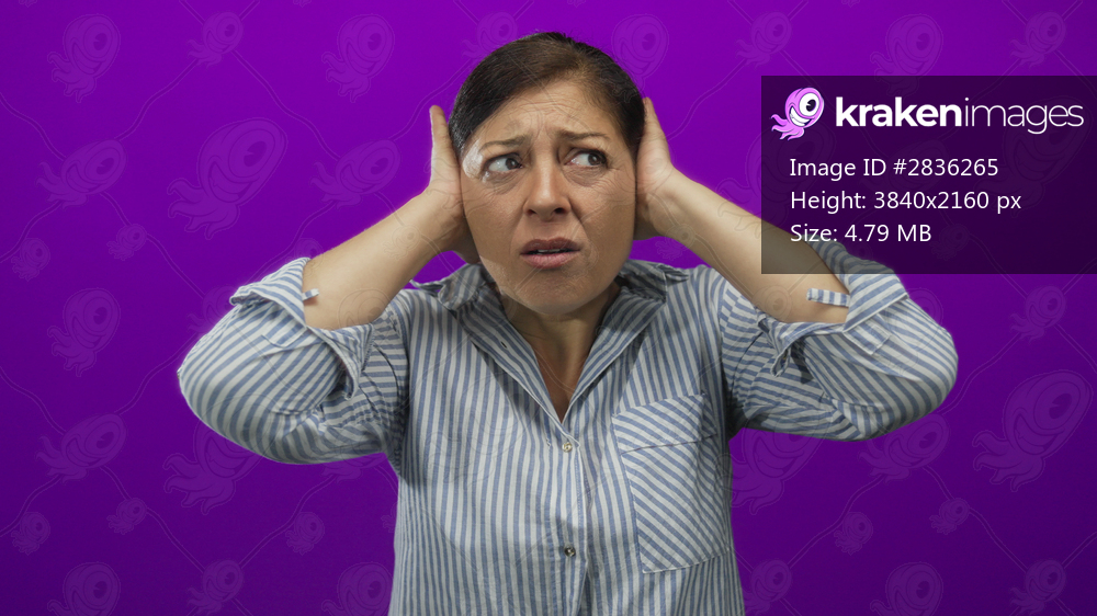 Hispanic woman wearing striped shirt covers ears with both hands in studio under purple lighting; pain.