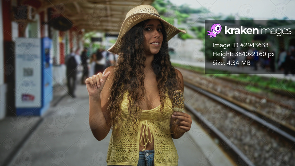 Hispanic woman wearing sunhat points finger while holding a sprinkled icecream on a street platform near train tracks under sunlight; summer vacation playful. - Kraken Images