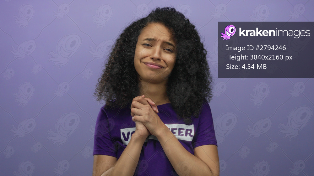 Hispanic woman wearing volunteer shirt against a purple background, expressing various emotions.
