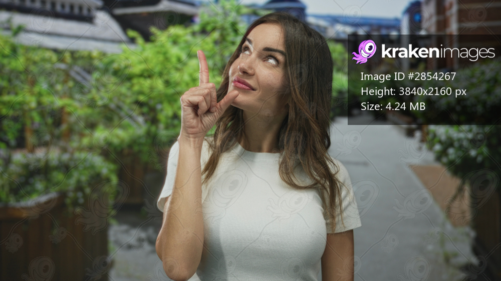 Hispanic woman wearing white top finger pointing up on street amid urban greenery planters; inspiration.