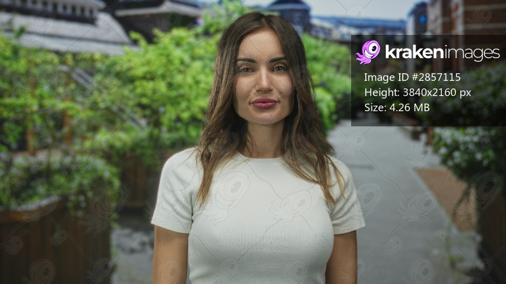 Hispanic woman wearing white top finger pointing up on street amid urban greenery planters; inspiration.