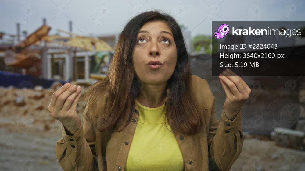 Hispanic woman wearing yellow shirt pinches fingers and closes eyes outdoors before a building; frustration.