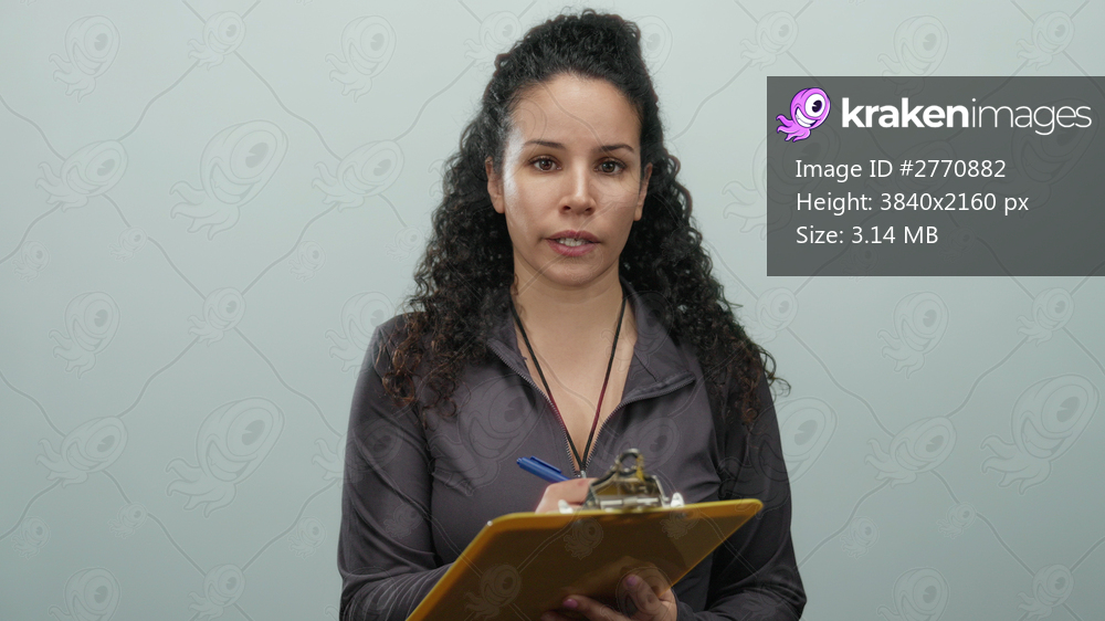 Hispanic woman writing on a clipboard against an isolated white background, conveying focus and concentration.