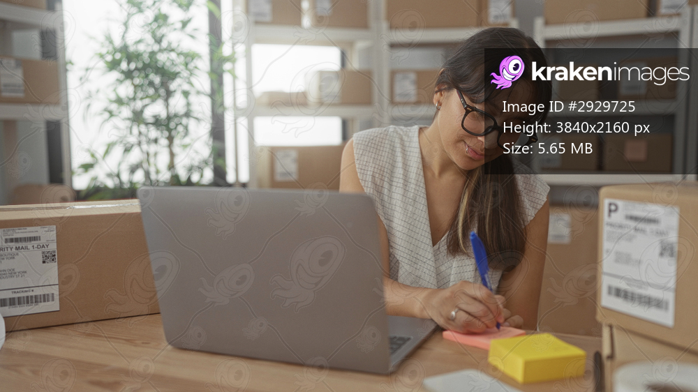Hispanic woman writing sticky notes and waving hand while packing parcels at a delivery desk in a warehouse building; small business focus.