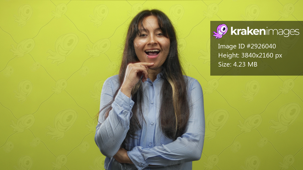 Hispanic woman young brunette with hand on chin gesture in lime green studio; thoughtful reflection introspection.