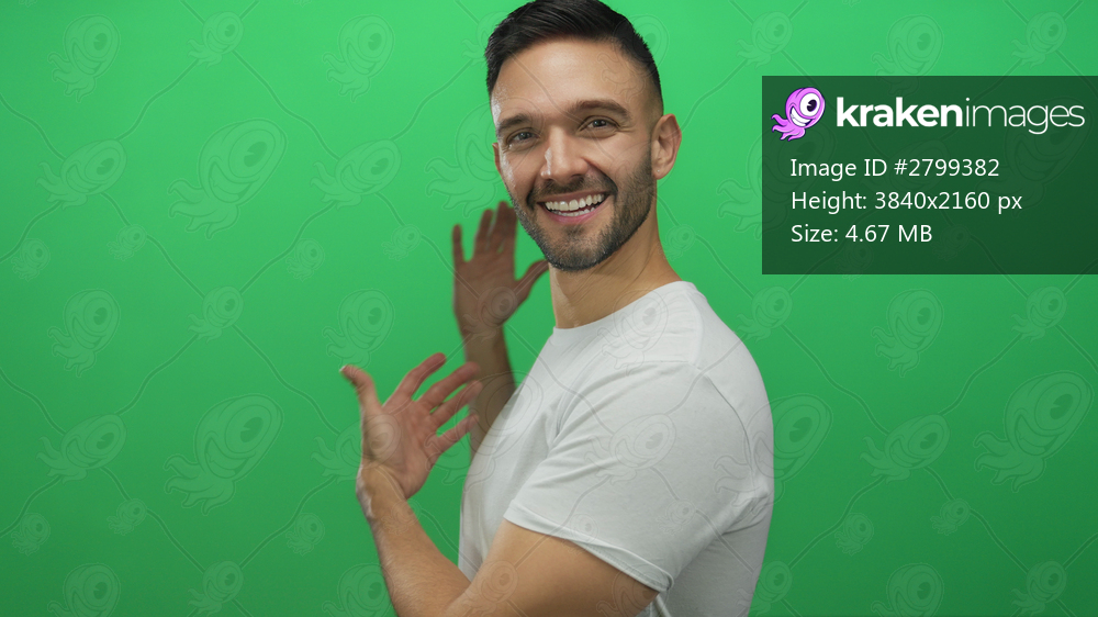 Hispanic young adult man in a white shirt smiles and gestures with hands towards green background, conveying friendly communication and an inviting expression. - Kraken Images