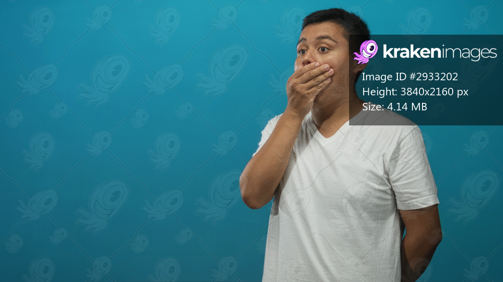 Hispanic young adult man in a white t shirt covering mouth while yawning in a blue studio setting; tired.