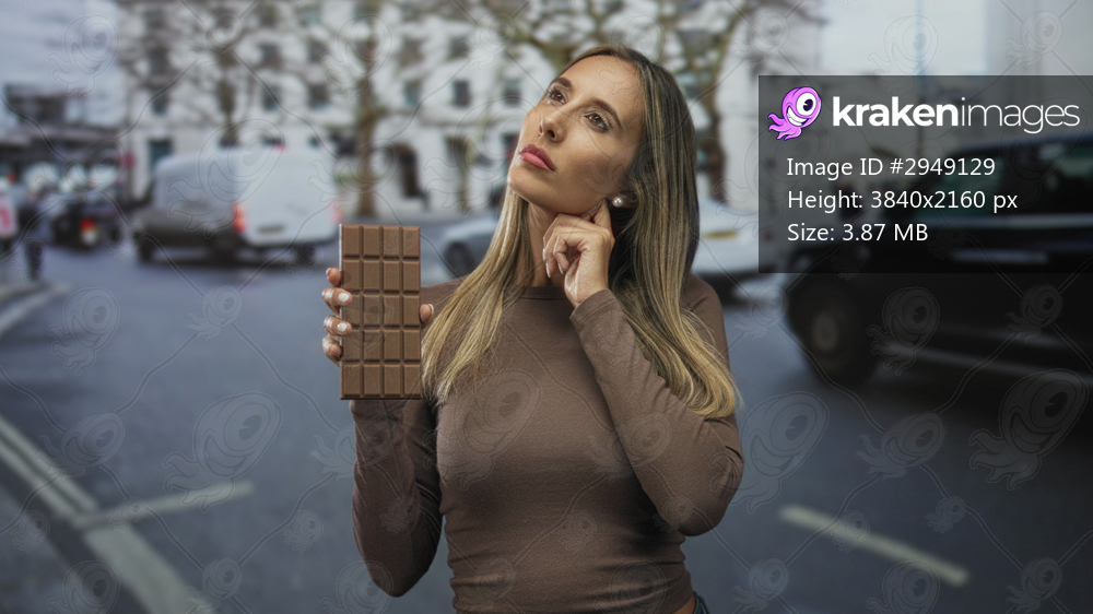Hispanic young blonde woman holding large chocolate bar with hand on chin on busy city street outdoors; contemplation.