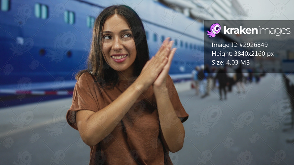 Hispanic young brunette woman clapping hands at port street beside blue cruise liner and passengers waiting; vacation joy.