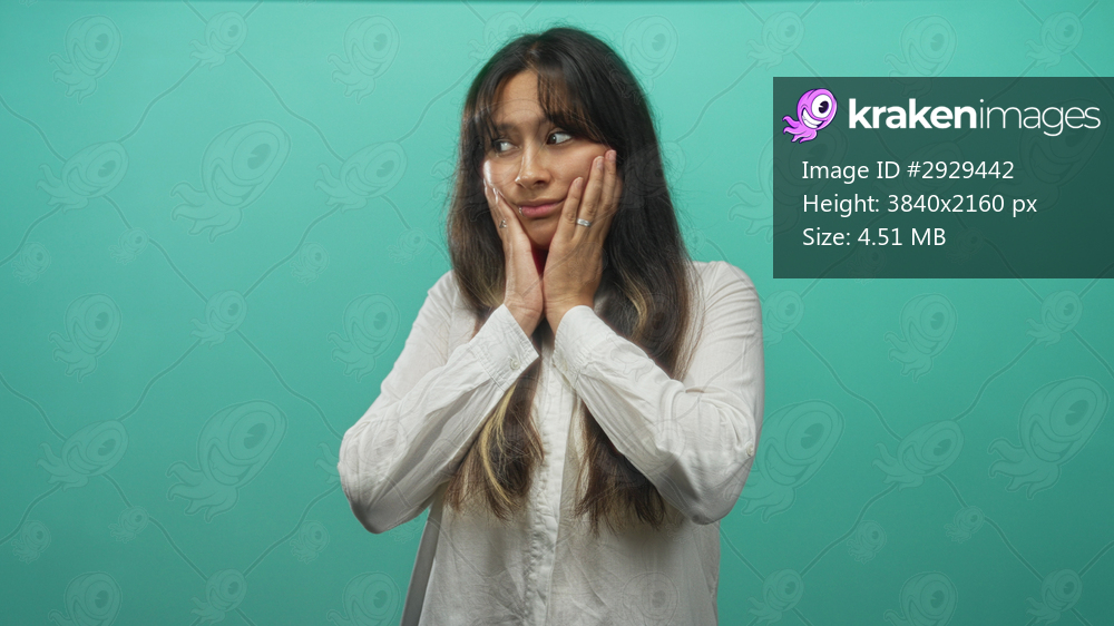 Hispanic young brunette woman with hands on cheeks and closed eyes in turquoise studio; thoughtful reflection introspection.