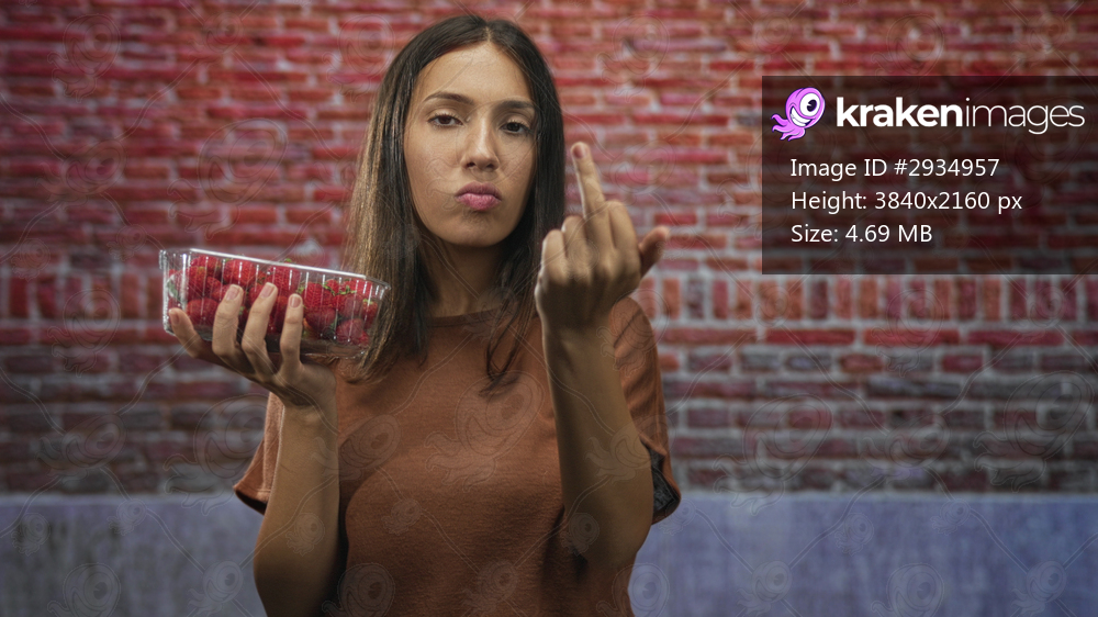 Hispanic young brunette woman holding a clear punnet of strawberries and showing her middle finger toward camera in a brick building; street defiance.