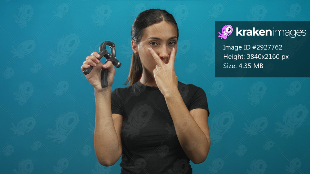 Hispanic young brunette woman holding a hand gripper and pointing finger toward camera in turquoise studio setting while wearing a black top and direct gaze; confidence focus. - Kraken Images