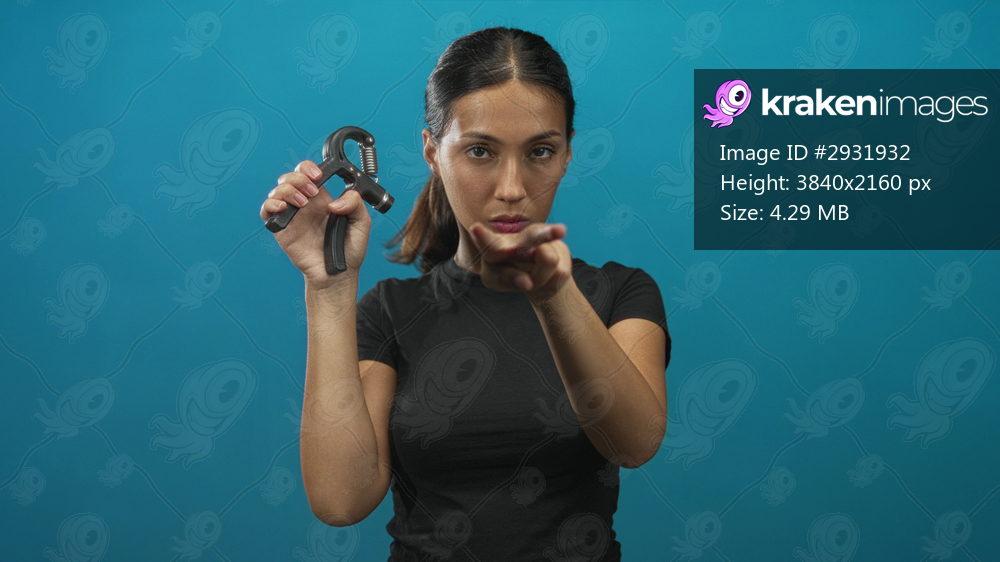 Hispanic young brunette woman holding a hand gripper and pointing finger toward camera in turquoise studio setting while wearing a black top and direct gaze; confidence focus. - Kraken Images
