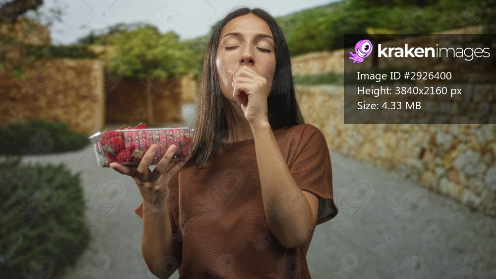 Hispanic young brunette woman holding a plastic clamshell of strawberries with hand to mouth for cough at building entrance outdoors; unwell.