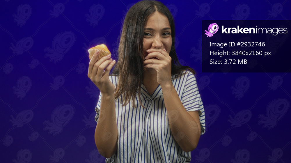 Hispanic young brunette woman holding cupcake and covering mouth with hand in blue studio; sweet amusement.