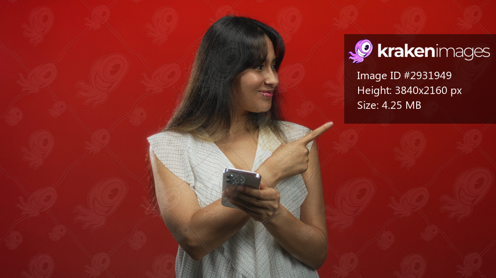 Hispanic young brunette woman holding smartphone and smiling while glancing sideways in red studio; playful curiosity.