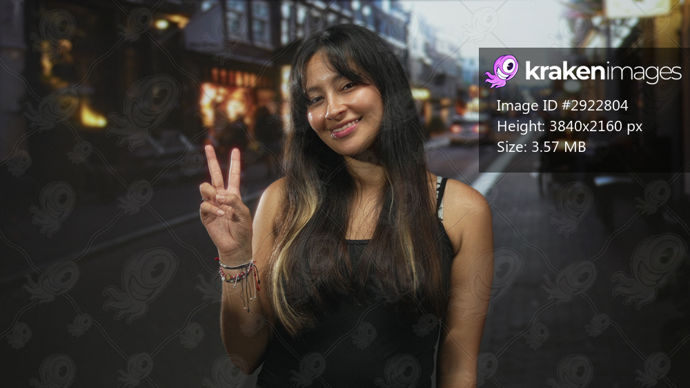 Hispanic young brunette woman holds up two fingers in peace sign on street with blurred cars and sidewalk cafes; joy.