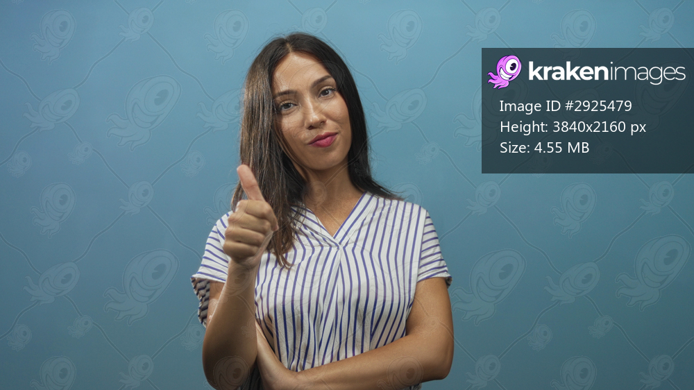 Hispanic young brunette woman in a striped shirt with arms crossed and pointing finger in blue studio; confidence.