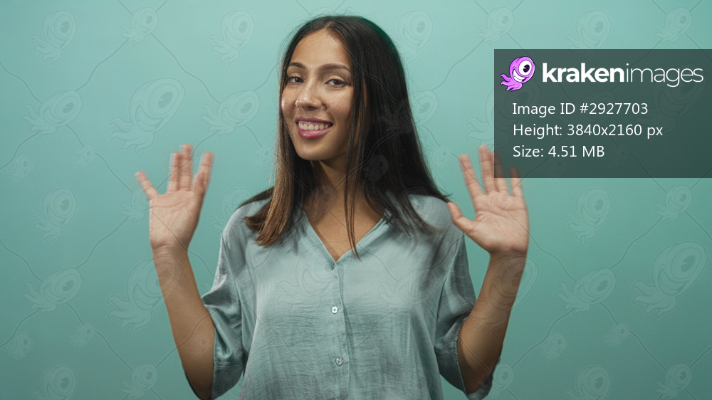 Hispanic young brunette woman raising both hands with palms visible wearing a light teal blouse in mint studio; joyful confidence.