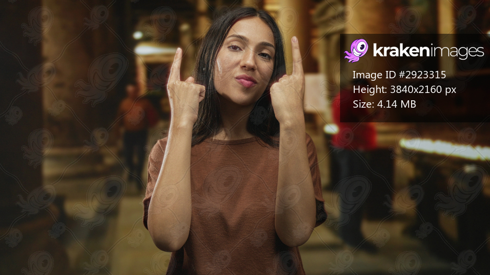 Hispanic young brunette woman raising both middle fingers toward camera in a church building aisle with votive candles; defiance protest irreverence.