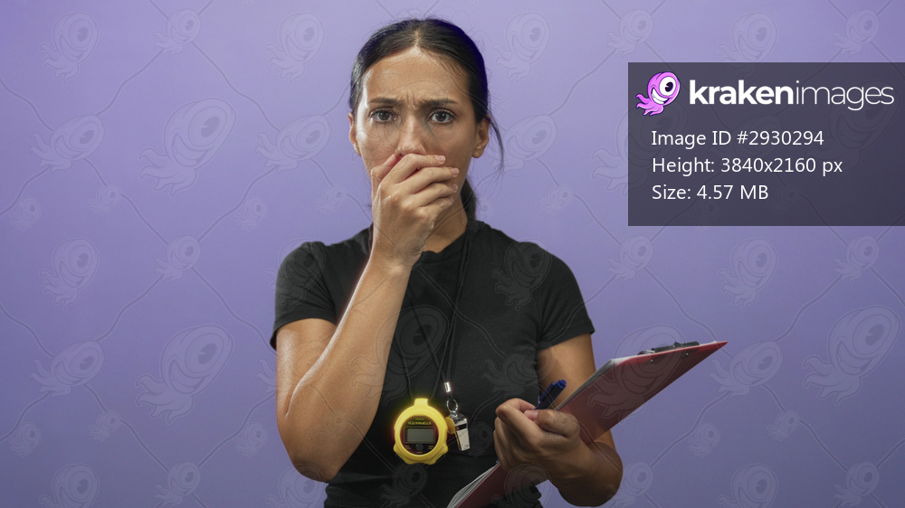 Hispanic young brunette woman referee holding clipboard, whistle and stopwatch with hand covering mouth in purple studio; surprise.