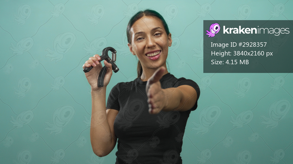 Hispanic young brunette woman smiling, holding a handgrip and extending her hand for a handshake in teal studio; confidence invitation.