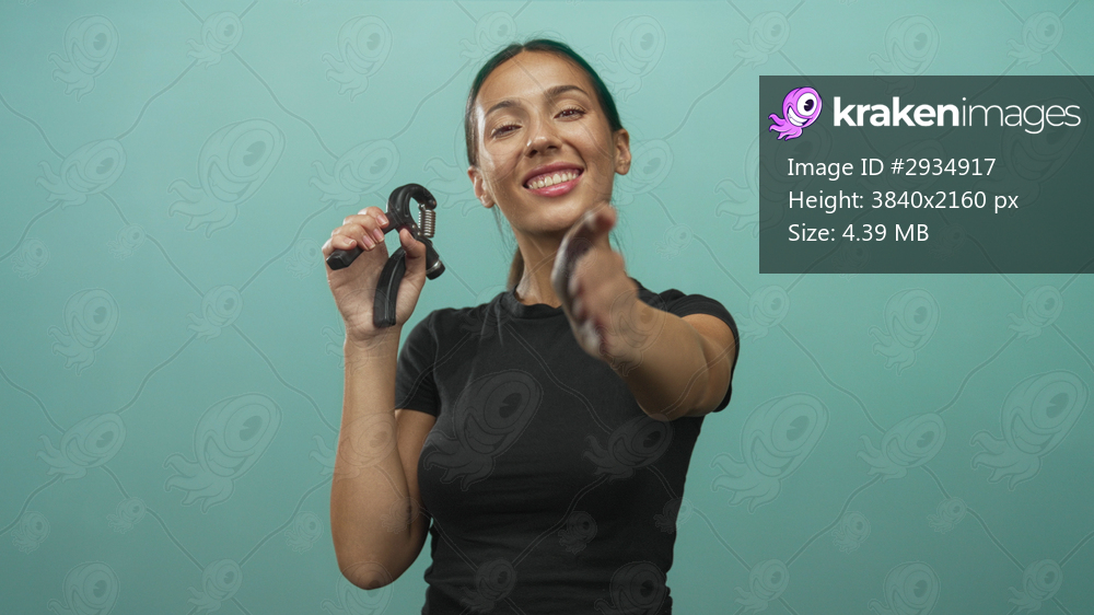 Hispanic young brunette woman smiling, holding a handgrip and extending her hand for a handshake in teal studio; confidence invitation.